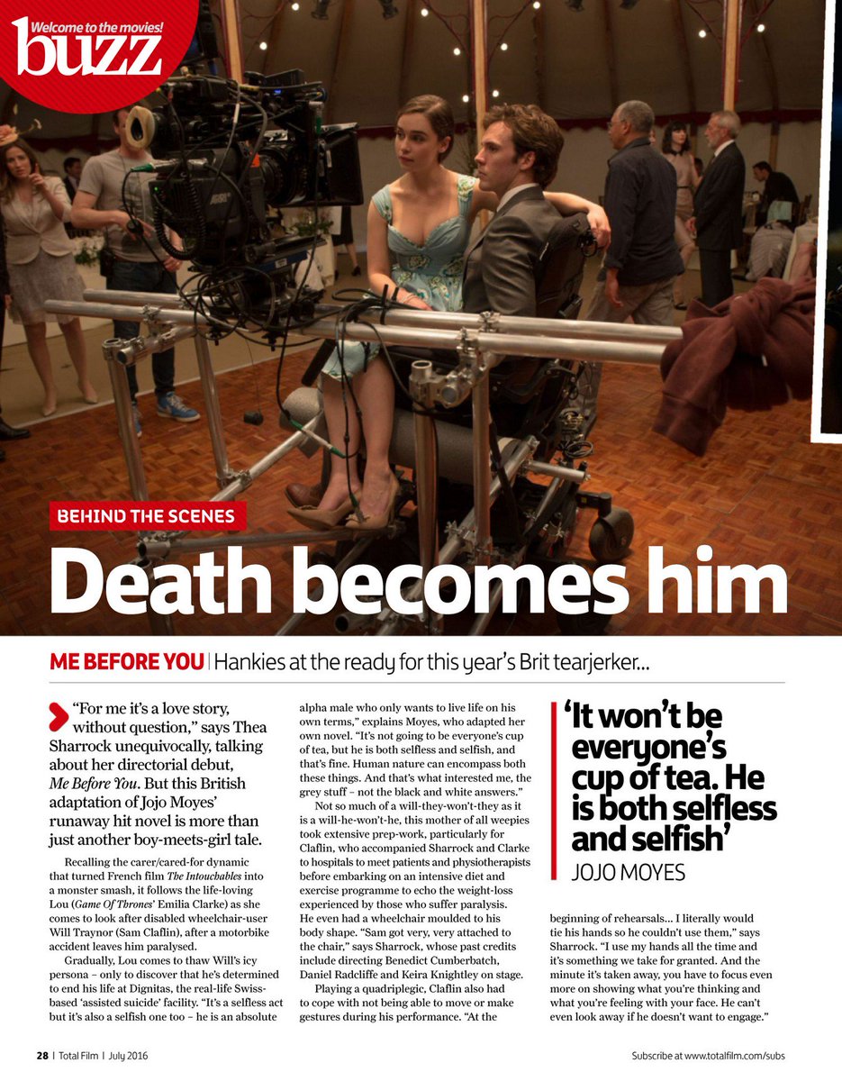 Ciertamente, en la ausencia de cualquier película de Richard Curtis en el horizonte. Yo antes de ti pueda llegar a ser este año, un brillante romance pero con el tema de la eutanasia, es uno de los temas más susceptible para debatir, así como también de las lágrimas, "Si, algo", dice Sharrock. "Creo que ahora entiendo más que nunca que es una elección individual y que todos tienen que respetar que todo el mundo es diferente ". JM