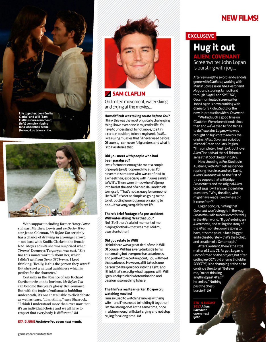Él esta radiante sobre la paternidad - "Estoy ya extrañándolo" - y a pesar de estar "en ese punto de cansancio en que los ojos duelen", es en todo momento educado y encantador. Él habla con el fotógrafo sobre Norwich FC y la última serie de catástrofes, hace un alboroto de un perrito pequinés que pasa y se hace querer a todos en el set con cuentos de los problemas de pañales cambiante (las palabras exactas son "manguera incontrolable"). El disfraz al estilo de Superman podría ser útil. Este año, Claflin está listo para hacer la transición de la estrella adolescente al hombre de la casa. Ya tiene éxitos en su haber: obtuvo un papel en la cuarta película de Piratas de la película del Caribe casi directamente saliendo de la escuela de teatro, entonces no eran Los juegos del hambre (ganó en total $ 2.3 mil millones, es posible que haya oído hablar de él), y Blancanieves y el cazador (el mes pasado que apareció en la secuela). Él ha dominado la comedia romántica, junto a Lily Collins in Love, Rosie, y ganó la aclamación de la crítica con The Riot Club. Pero su nuevo papel, como un parapléjico suicida en la adaptación de Jojo Moyes del 'bestseller Yo antes de ti lo aparta de todo lo que ha hecho antes.
